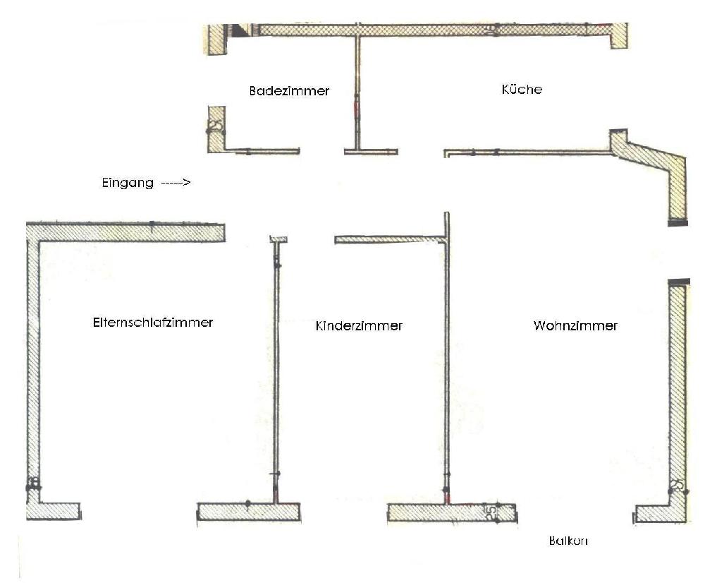 Die Wohnung verfügt über Balkon, Parkett im Wohnzimmer, restliche Zimmer mit Marmoleum, Küche und Badezimmer mit einfachem Standard.