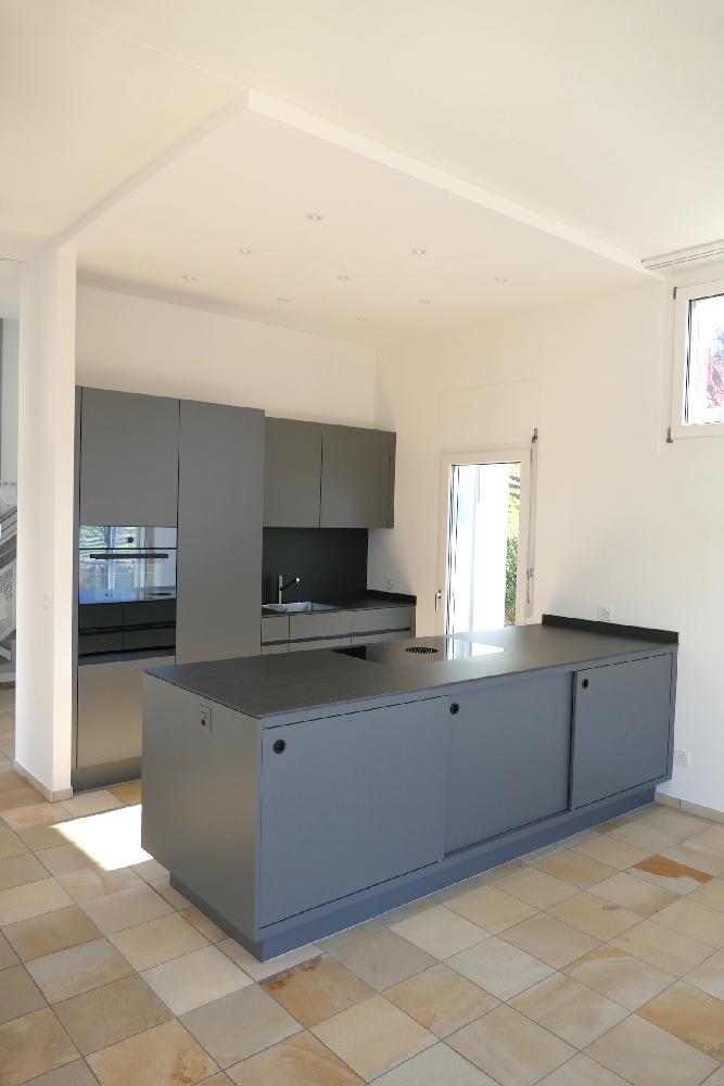 Moderne Küche mit Kochinsel & integriertem Dunstabzug