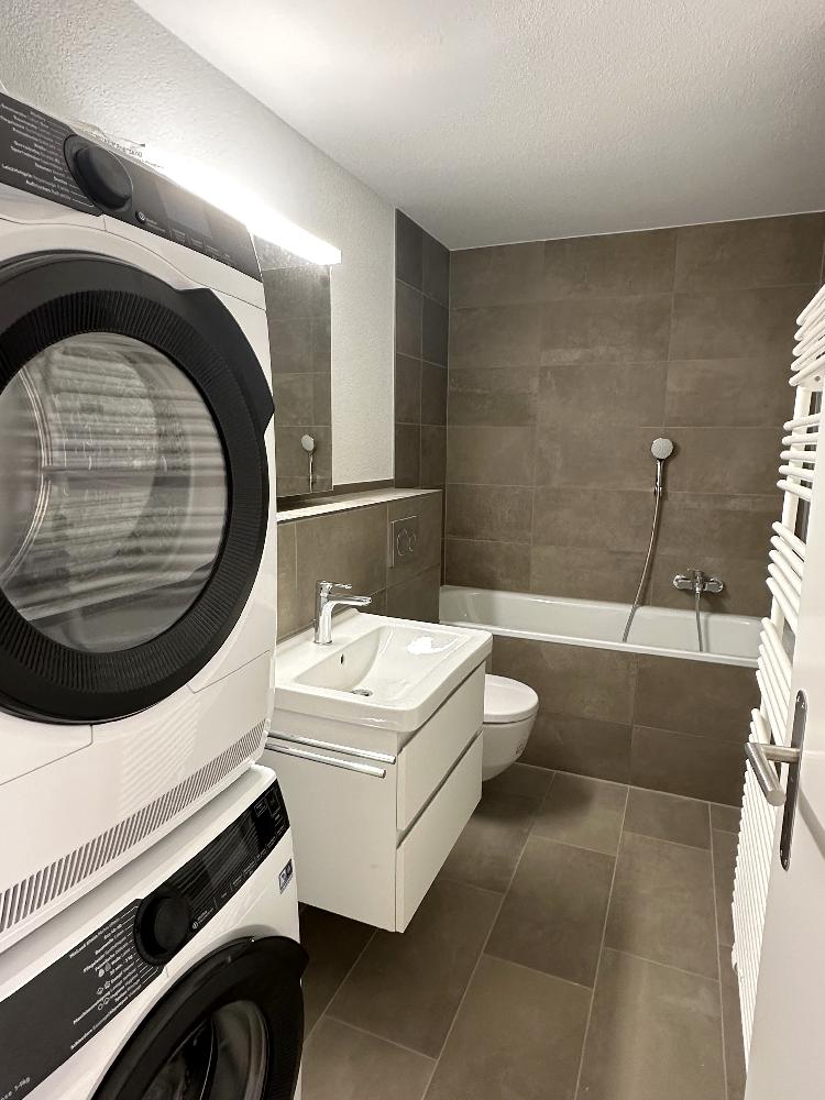 Ruhige, sonnige und kinderfreundliche Lage mit wunderschönem Blick ins Grüne in bevorzugtem Wohnquartier. Komplett sanierte Wohnung mit Eichenparkett, eigenem Waschturm in der Wohnung sowie einigen Einbauschränken, Badezimmer mit Badewanne und Dusche sowie sep. WC, Abstellraum, zwei Balkone.