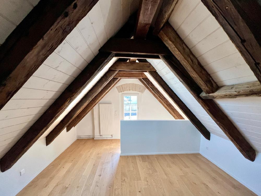 Historische Bausubstanz mit Sichtbalken, Parkettböden, moderne Wohnküche.