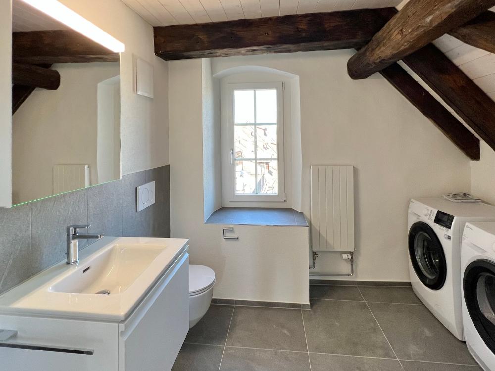 Ein Bad mit Dusche im Dachgeschoss, separates WC mit Waschmaschine und Tumbler im Wohngeschoss.