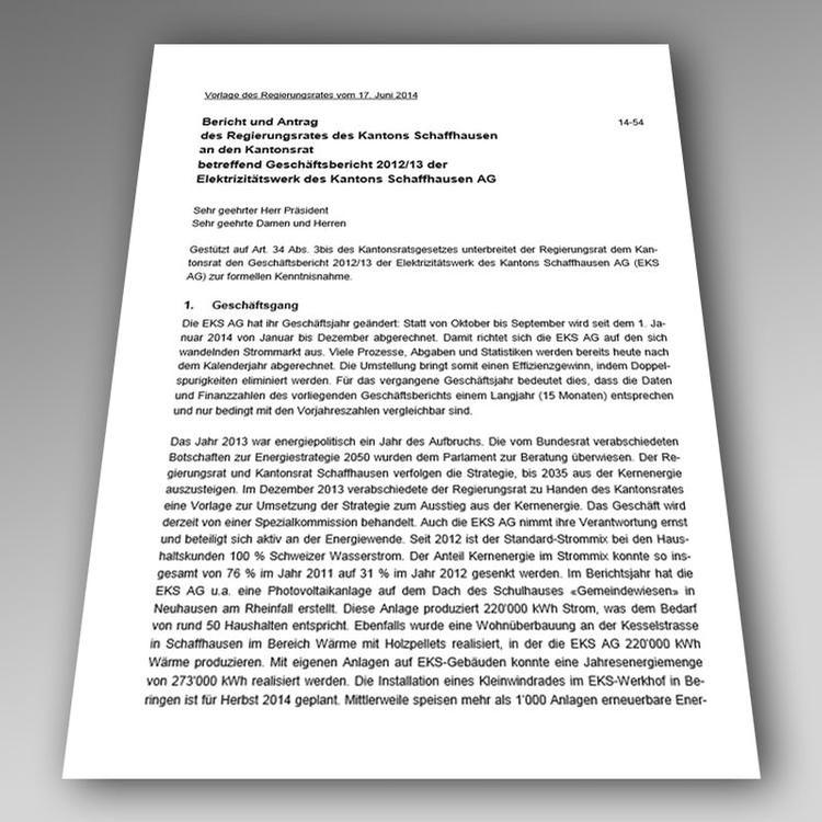 Der Regierungsrat unterbreitet dem Kantonsrat den Begleitbericht zum Geschäftsbericht 2012/2013 der Elektrizitätswerk des Kantons Schaffhausen AG (EKS AG). Das Unternehmensergebnis der EKS AG von 8,9 Mio. Franken ist erfreulich, umso mehr, als das Marktumfeld nach wie vor sehr anspruchsvoll ist. Auch die Bilanz der EKS AG ist weiterhin solide. Die Dividende beläuft sich auf 4,87 Mio. Franken. Davon erhält der Kanton Schaffhausen mit einer Beteiligung von 75 % an der EKS AG knapp 3,7 Mio. Franken.