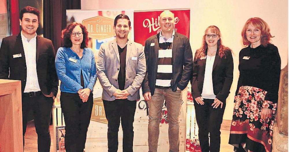 Die drei Freunde Patrick Stauffacher, Robin Schmanau und Blerton Gashi wurden zu Jungunternehmern, nachdem sie sich in ihrer WG-Küche auf die Suche nach einem neuen Getränk für ihre Cocktails gemacht hatten. Sie trafen einen Geschmack, der auch an der Bartheke auf Begeisterung stiess. Das ist nunmehr knapp drei Jahre her. Was in dieser Zeit alles geschah, erzählten die beiden Erstgenannten in einem spannenden Dialog den rund 90 Gästen, die der Einladung gefolgt waren. Die Erfinder von Dr. Ginger zeigten Mut zum Risiko. Der Erfolg gab ihnen recht. Sie setzten auf Wachstum und reinvestierten, was sie einnahmen. Dass sie sich auf ihrem Erfolg ausruhen, kommt für die drei Unternehmer nicht in Frage. Für 2020 planen sie den Verkauf ins Ausland zu erweitern. Mit «Hibille» haben sie einen neuen, lieblichen (Damen-)Likör kreiert. Bestehend aus Hibiskus und Vanille, wird er mit Prosecco aufgegossen. Der nächste Sommerdrink ist parat! Auf dem Bild, von links: Nico Rot (OBT), Ursula Liberato (OBT), Patrick Stauffacher (Dr. Ginger), Robin Schmanau (Dr. Ginger), Bianca Sauter (OBT) und Yvonne Ried (OBT). (r.)