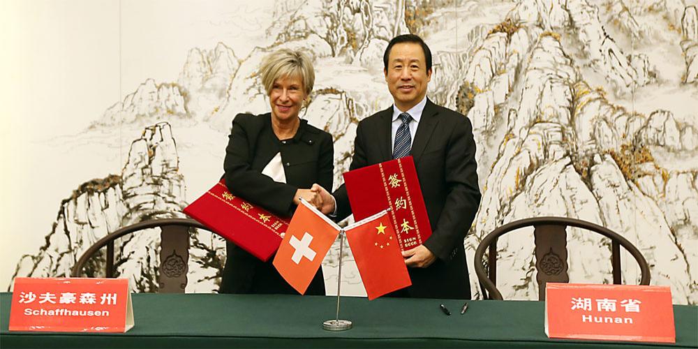 Heute wurde in Changsha, China, die Partnerschaftsvereinbarung zwischen dem Kanton Schaffhausen und der chinesischen Provinz Hunan unterzeichnet. Der Kanton Schaffhausen unterstreicht mit dieser Vereinbarung seinen Willen zur Stärkung des wirtschaftspolitischen Austauschs mit China. Am feierlichen Akt nahmen die offizielle Schaffhauser Delegation und der Schweizer Botschafter teil.