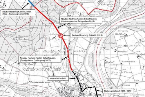 Seit der Inbetriebnahme des Naturzentrums Thurauen nimmt der touristische Radverkehr zwischen Flaach und Rafz kontinuierlich zu. Das Fahren auf der stark befahrenen Kantonsstrasse mit einem hohen Anteil an Schwerverkehr ist für Velofahrer unangenehm und gefährlich, weshalb in Abstimmung zwischen den Kantonen Zürich und Schaffhausen ein durchgängiger Radweg ohne Querungsstellen gebaut werden soll. Die Radwegverbindung ist in den Richtplänen der beiden Kantone enthalten. Die Realisierung zwischen Rafz und Rüdlingen-Sandgruben ist im Jahr 2018 geplant. Der Abschnitt zwischen Rüdlingen-Sandgruben und dem Dorf Rüdlingen ist derzeit noch in der Projektierungsphase und wird voraussichtlich im 2020 realisiert. Im südlichen Abschnitt zwischen dem Dorf Rüdlingen und dem Rheinübergang wurde der Radweg bereits früher realisiert.