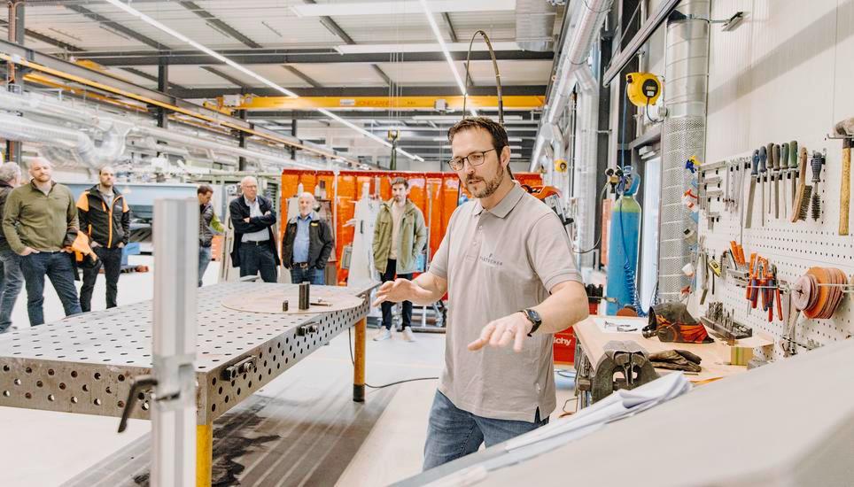 Wetter und sein Team haben sich auf die drei Bereiche Metall, Stahl und Glas spezialisiert. In der fast 90 Meter langen Halle sind die Bereiche mehrheitlich voneinander getrennt: Stahl rechts, Metall links. Alles wird von Norden her angeliefert – Lastwagen können sogar in das Gebäude hineinfahren – und verlässt die Produktionshalle nach der Weiterverarbeitung im Süden Richtung Strasse. Es finden sich spannende und sicherlich teure Maschinen wie Blechpressen und Glassauger im Gebäude – Letzterer kann via Vakuum Glasscheiben mit einem Gewicht von bis zu einer Tonne heben.