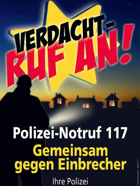Begleitet werden die präventiven Massnahmen durch verstärkte polizeiliche Patrouillen- und Kontrolltätigkeit. Dauern wird die Kampagne voraussichtlich bis Ende Februar 2013. Benachrichtigen Sie umgehend über Telefon 117 die Polizei (auch tagsüber), wenn